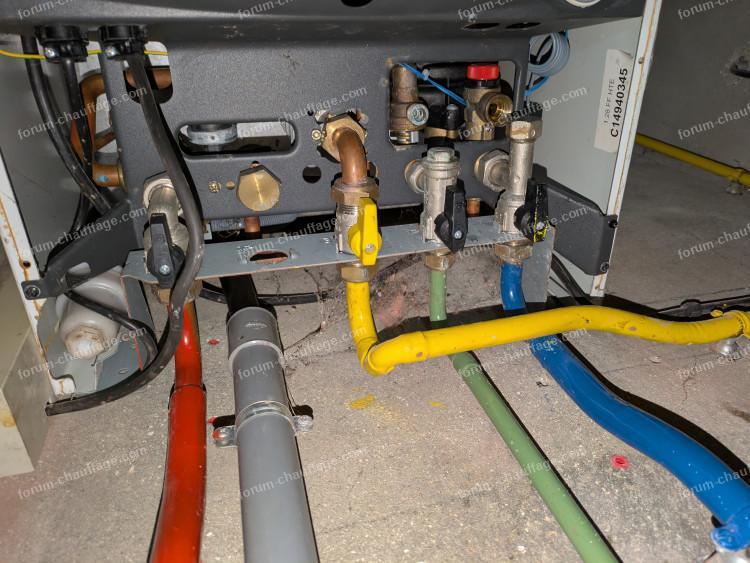 Sur une des photos du dessous de la chaudière il est étrange de voir que la manette de la vanne de remplissage ( selon le constructeur ) indique qu'elle est ouverte ... On peut supposer qu'il y a une vanne plus bas sur le tuyau vert.
