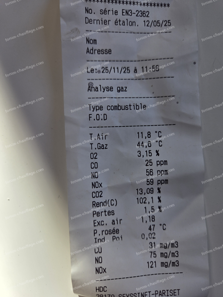 - Le technicien a remplacé le gicleur d'origine (0.4 60S) par un 0.5 60H et a refait les réglages de la chaudière. Le relevé joint correspond à ce nouveau gicleur. J'ai été très surpris car je pense que les "H" et les "S" diffusent le nuage de fioul différemment, mais le technicien m'a affirmé que le sien était meilleur.