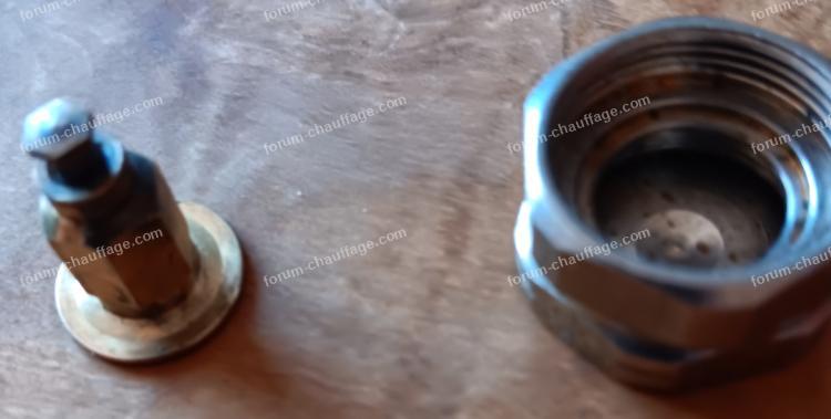 Le bouchon que vous avez déposé au départ est en deux parties le bouchon et un raccord qui empêche d'enlever cette vis hexagonale, cette petite pièce est un butté de réglage qui sert pour équilibrer l'installation de chauffage pour ne pas ouvrir le té de réglage au maximum.